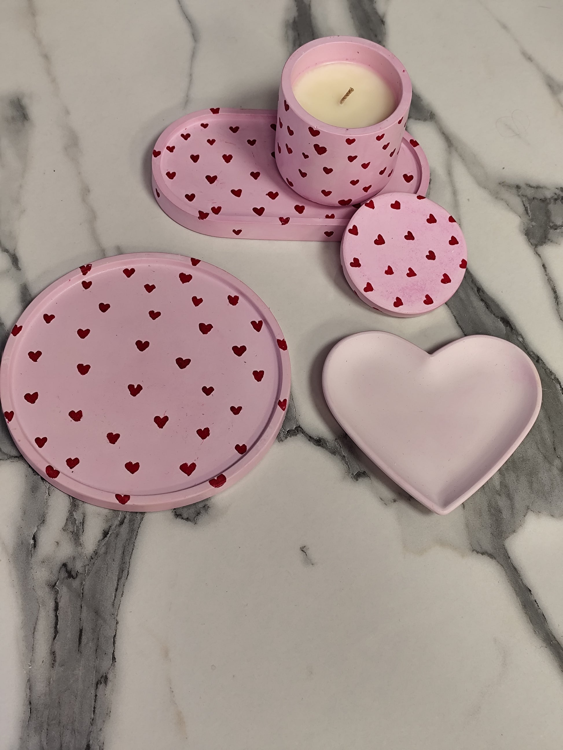 Αποτελείται απο δοχείο κεριού γεμισμένο με 150 γρ φυτικό κερί σόγιας, απο 1 οβαλ δισκο, 1 στρογγυλό δίσκο και εναν δίσκο σε σχήμα καρδιάς.