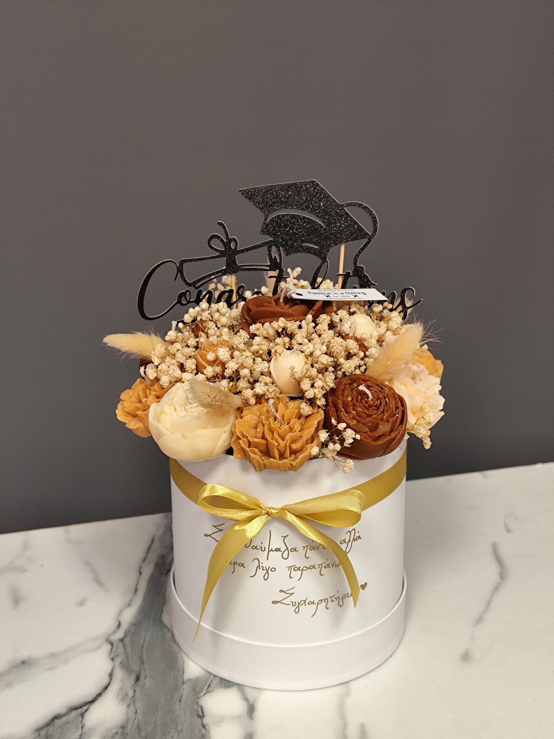 Αν θέλετε το μπουκέτο σας να γίνει πιο ξεχωριστό σας δίνετε η δυνατότητα παρακάτω να σημειώσετε το δικό σας μοναδικό κείμενο που θέλετε να αναγράψουμε επάνω. Αν επιθυμείτε να περιέχει και κάποιο κερί με νούμερο ηλικίας μπορείτε επίσης να το σημειώσετε παρακάτω.