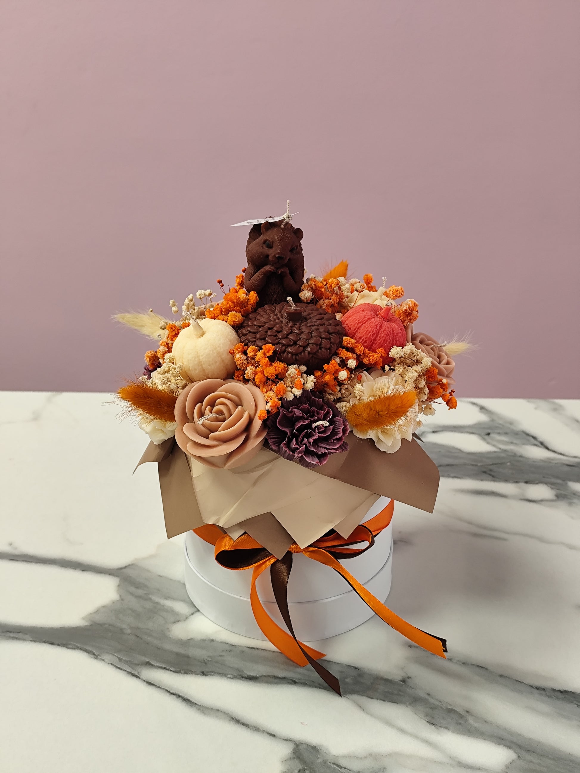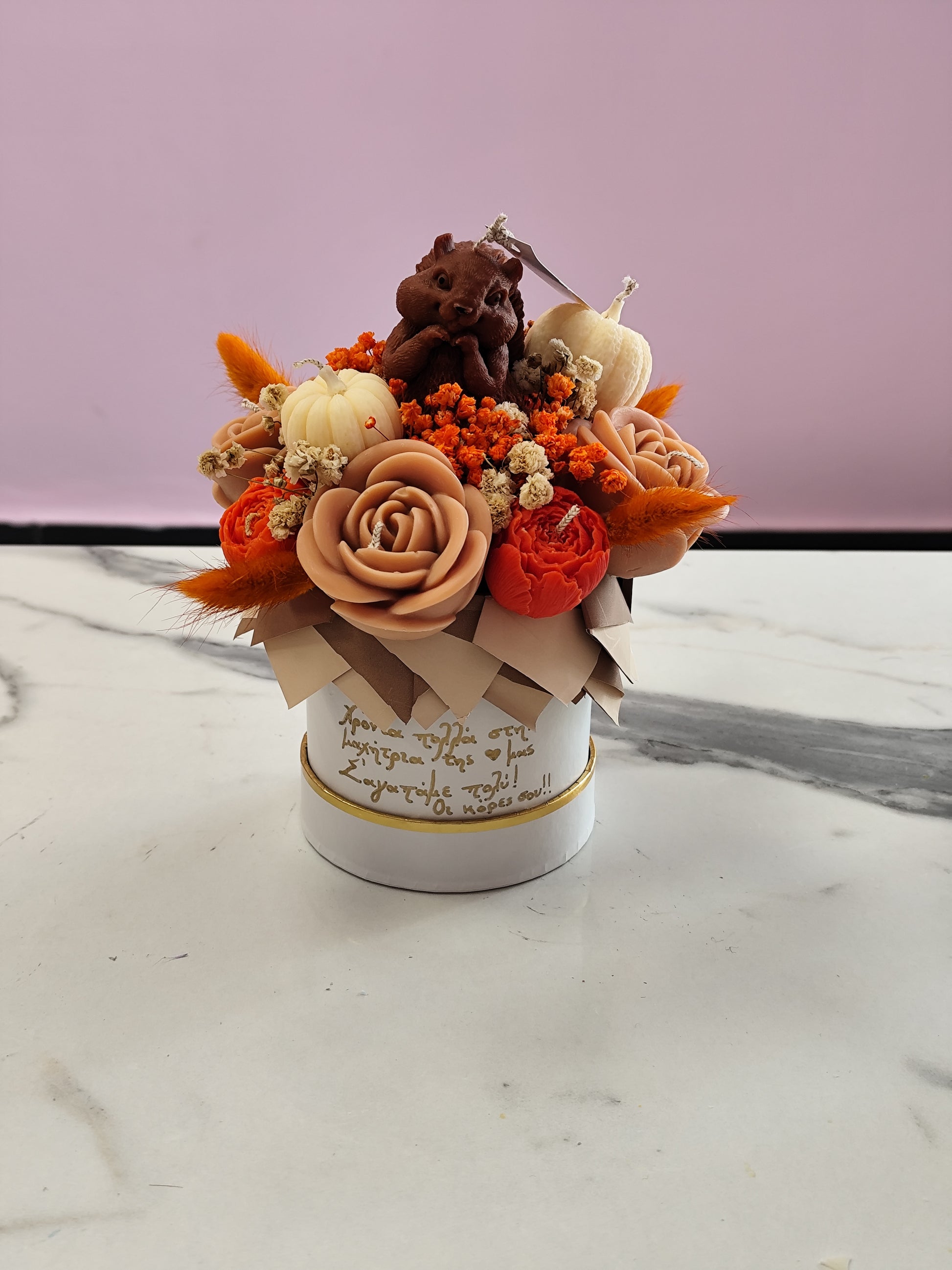 Μπουκέτο από κερί με σκίουρο και κολοκύθες σε φθινοπωρινά χρώματα και αρώματα.
